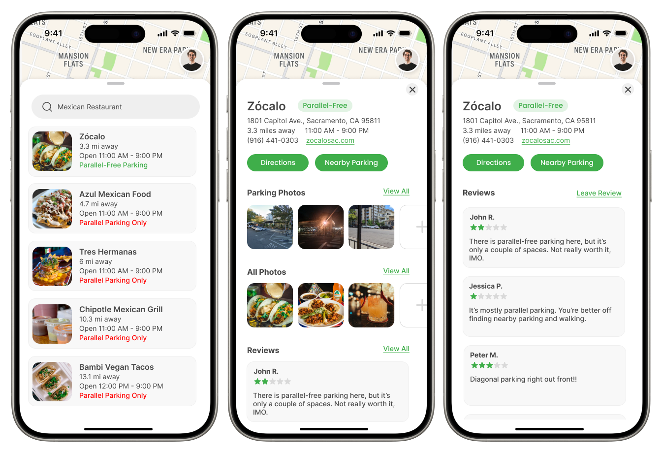 While some of the apps on the market today have some helpful parking information, none of them really put a focus on parallel parking or offer clear language on what type of parking is available. This can make it confusing for users to decipher what the parking situation will be when they arrive.