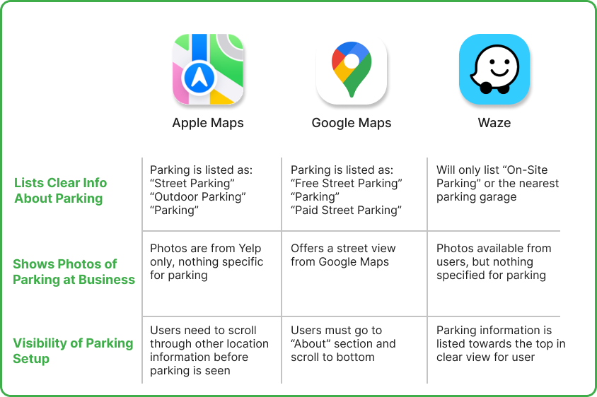 After researching the various issues and “solutions” that people have come up with for parallel parking, I decided to check if there was anything on the market that directly addressed the problem of parallel parking by digging into 3 popular map/navigation apps.