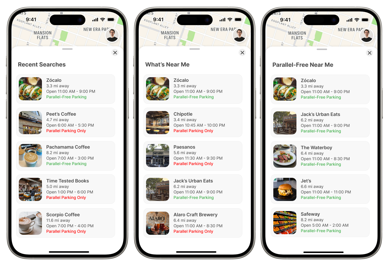 These features allow the user to look back on past searches to easily navigate to a destination they liked before, search what’s near them to make easy choices on the fly, and find parallel-free parking situations where they won’t have to worry about parking at all.